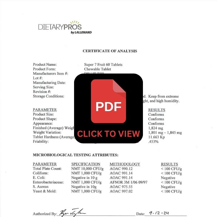 Super7 is a delicious, nutrient-packed chewable featuring seven powerhouse superfruits: Amalaki, Acai, Goji, Mangosteen, Pomegranate, Blueberry, and Cranberry. This potent blend delivers essential vitamins, antioxidants, and enzymes to support immune health, energy, and overall wellness. Together, these superfruits work synergistically to give your body a natural boost of vibrant nutrition—anytime, anywhere!